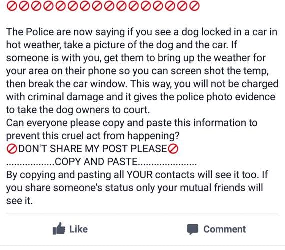 The message states: “The Police are now saying if you see a dog locked in a car in hot weather, take a picture of the dog and the car. If someone is with you, get them to bring up the weather for your area on their phone so you can screen shot the temp, then break the car window.
