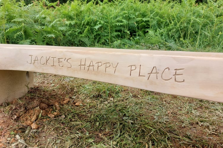 Last year Jackie died. We were all very sad. Some of her friends at Devon Wildlife Trust set to and made the components for an oak bench to be set up in Andrew’s Wood, which Jackie used to call “My Happy Place”. They engraved that on her bench. Recently, a group of us gathered to set up the bench in memory of Jackie and her work for the Devon Trust. The strongest of us, men and women, carried the bench down to Cuckoo Field, dug deep holes in which to mount the legs and slot in the wide oak seat. Some of us, not so strong, trimmed the surrounds and made a list of all the plants growing near Jackie’s bench.