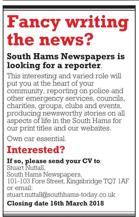 Interested? If so, please send your CV to Stuart Nuttall, Editor, South Hams Newspapers, 101-103 Fore Street, Kingsbridge TQ7 1AF or email [email protected]