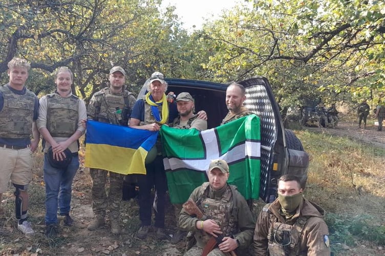 Two former Kingsbridge Community College students are possibly the first to hold up a Devon flag in the no man’s land between the border of Ukraine and Russia.
