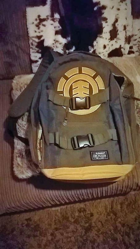 He describes the Element backpack having a “sandy yellow logo and a sandy yellow bottom”, with a black patch at the bottom, two front clips and a chest strap.