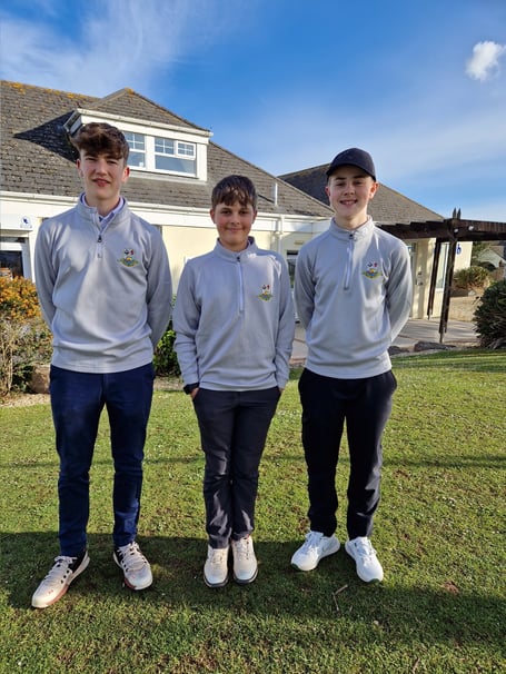 λ Thurlestone juniors William Hoskin, Aiden Mulligan and Bill Gary were in action for the Devon County Basil Steer knockout on Thursday against Exeter at Churston but although they fought hard it was not their day and they lost 3-0. The junior team will be in the Tamar Cup knockout and National Golf knockout later in the year and we wish them good luck.